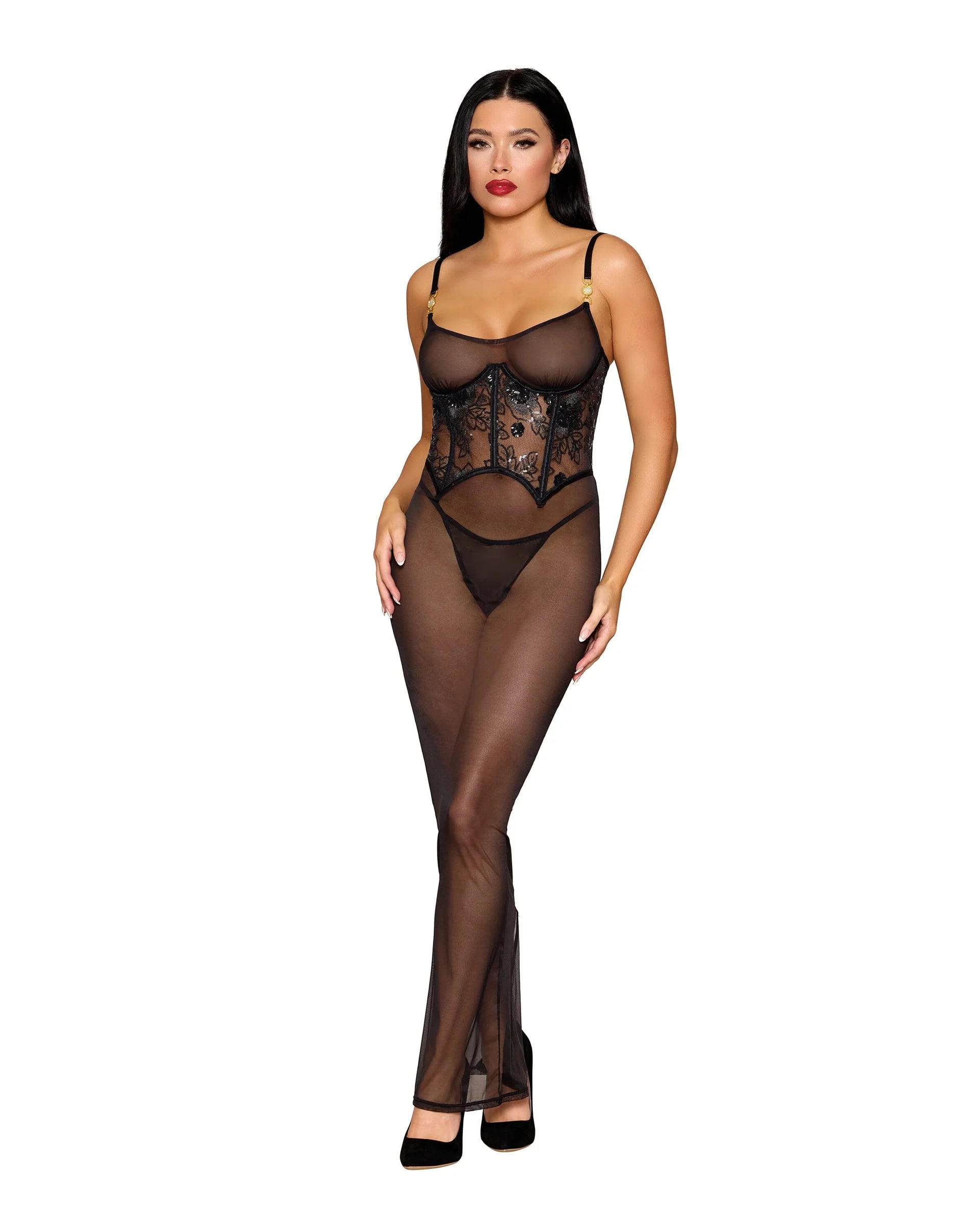 Vestido de mesh stretch con corset bordado de lentejuelas en la cintura y tanga a juego.