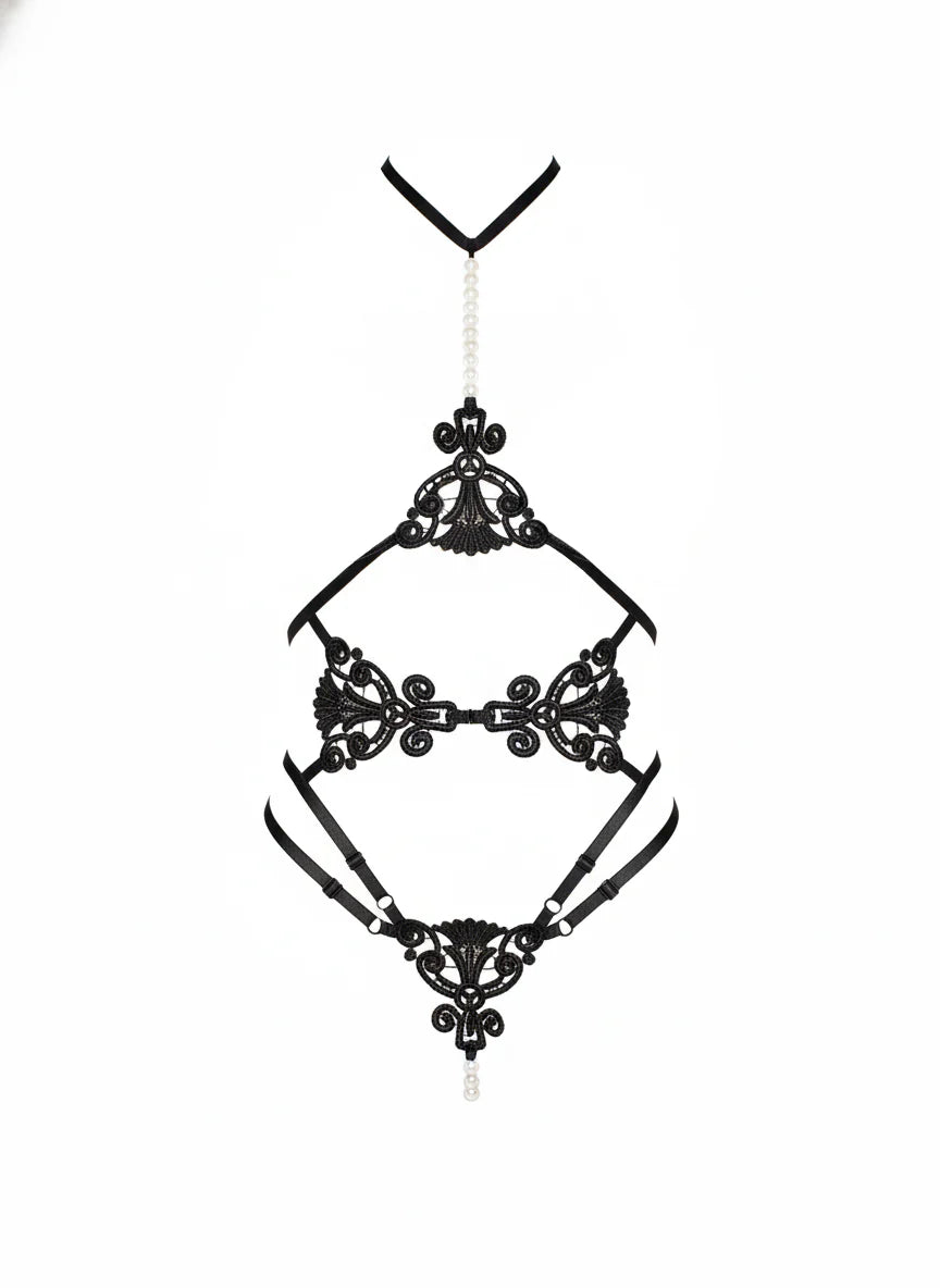 Apliques bordados negros enmarcan el diseño de copa abierta, mientras que un detalle halter con perlas y un panty a juego también realzan el look. Con tirantes ajustables para un ajuste perfecto, este look de lencería sensual está hecho para noches inolvidables.